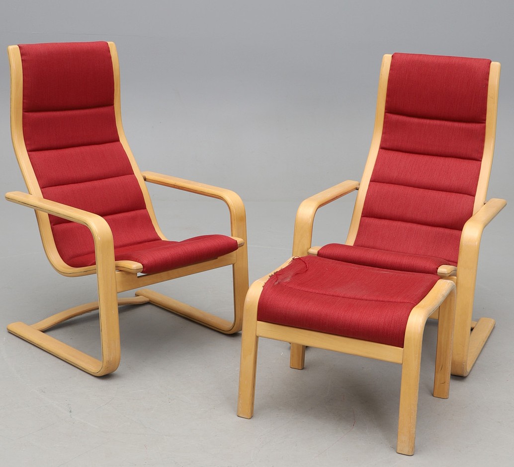 Vilstol – fåtölj med fotpall. Formgiven av Bruno Mathsson och tillverkad på Firma Karl Mathsson i Värnamo.