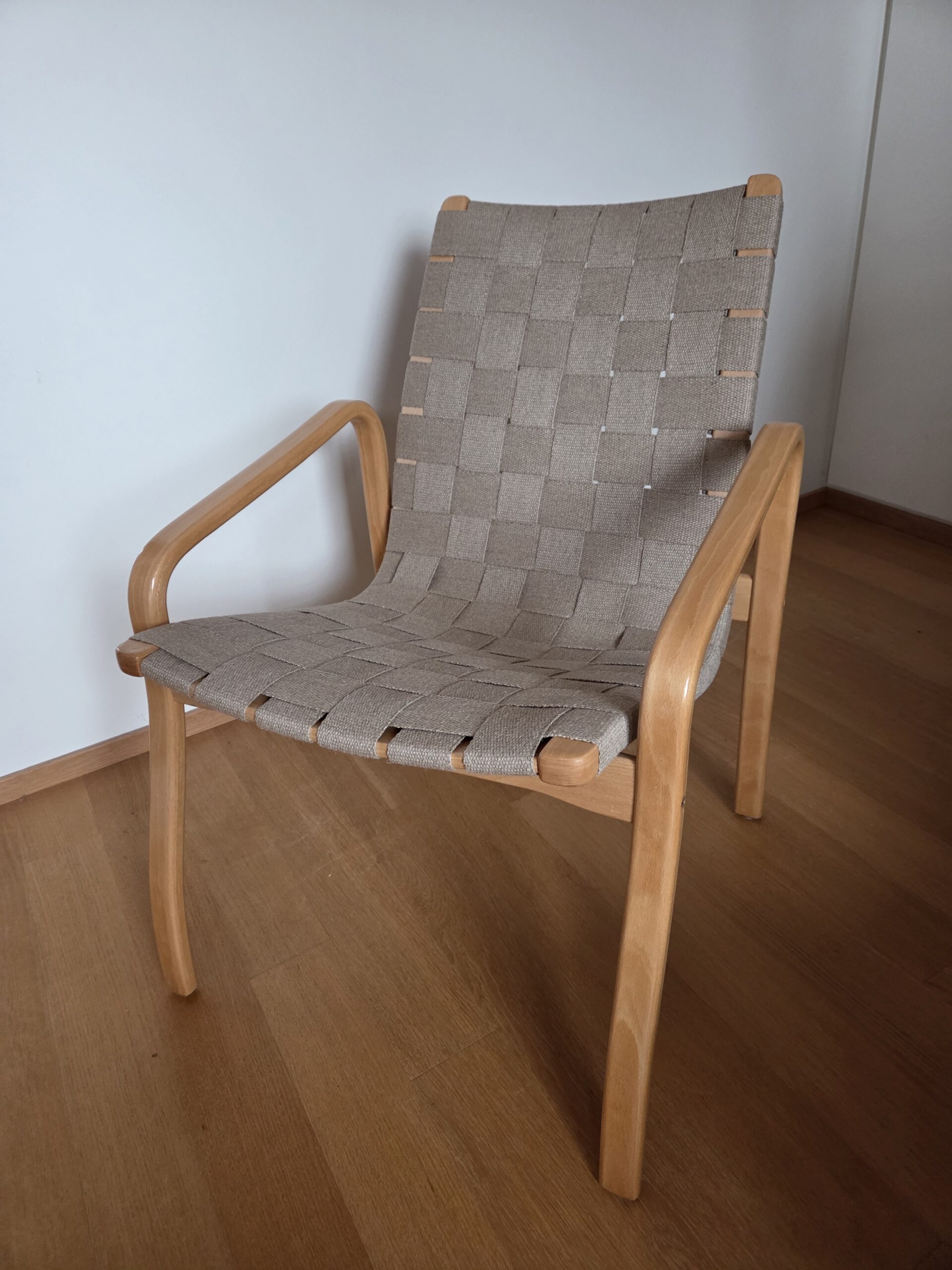 Fåtöljen som Alvar Aalto formgav 1947. Tillverkade i Finland av Artek, böjlimmad björk.